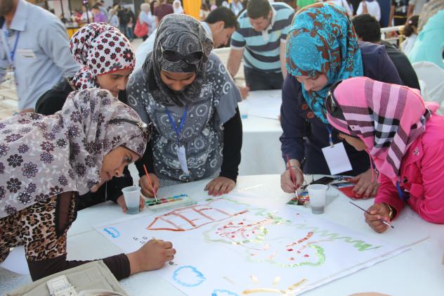 شجعت الحاضرين إنو يشاركوها برسمات ومشاريع فنيه معموله من أي اشي حولهم من ورق مستعمل إلى أدوات غير تقليديه